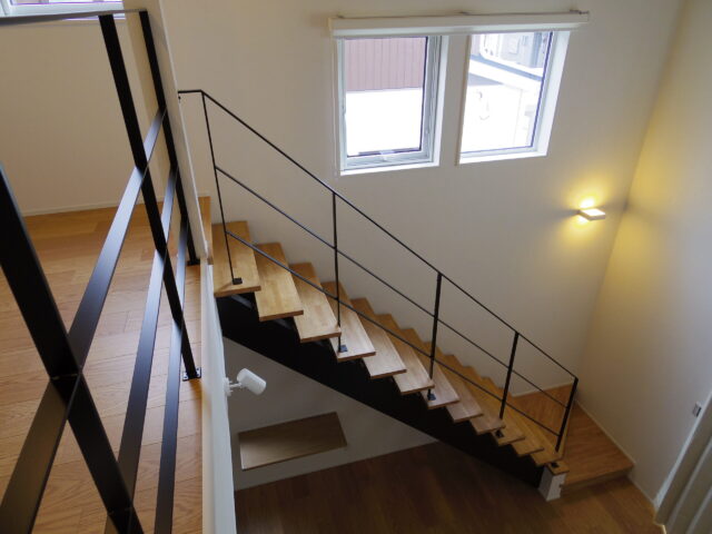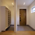 白色系塗壁調の吹付外壁と、木目調の玄関ドアが映えるシンプルモダンな住まい。 オーダーメイドのリビング階段と多くの間接照明を採用、フラットバーを使用した手摺材にもこだわりを感じます。 広々とした玄関・ホールにはシューズクローゼットがあり、ご家族みんなで使用可能なウォークインクローゼットもございます。 施主様と共にじっくりとお打合せをさせていただきながら建築された、完全オーダーメードの建物となっております。