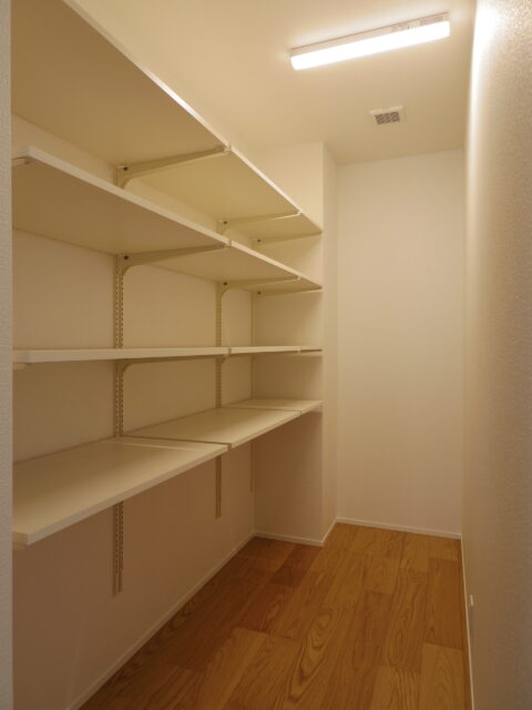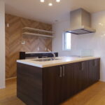 白色のタイル調外壁と木目調外壁材を合わせた洋風の住まい。 各収納場所の棚材など設置方法や使用方法の検討、家事室や食品庫など各お部屋への動線にもこだわりました。 広い水廻りやLDK・ウッドデッキもある家族団らんの住まい。 施主様と共にじっくりとお打合せをさせていただきながら建築された、完全オーダーメードの建物となっております。